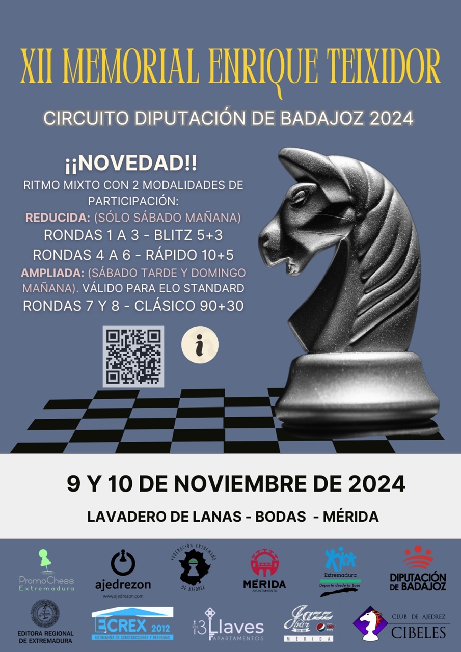 Los días 9 y 10 de noviembre, tendrá lugar el XII Memorial Enrique Teixidor (Open Sub2400), en el Lavadero de Lanas, con diferentes modalidades de participación. Organiza Club de Ajedrez Cibeles