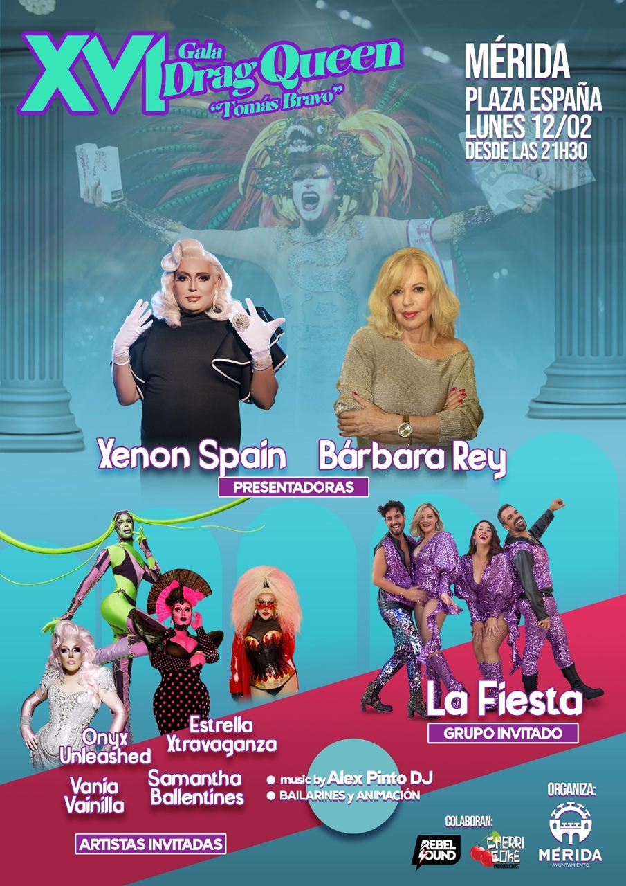 En esta ocasión, la drag nacional Xenon Spain y la actriz y presentadora Bárbara Rey serán la encargadas de presentar el acto que contará con actuaciones de drags reconocidas en todo el país como Estrella Xtravaganza, Onyx, Samantha Ballentines y Vania Vainilla. También actuará el grupo La Fiesta y el dj emeritense Alex Pinto amenizará los minutos previos y las transiciones entre artistas