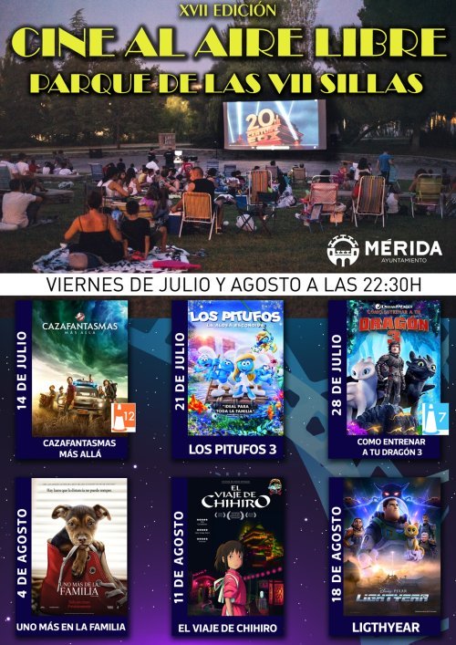 El ciclo comenzará el 14 de julio con la comedia “Cazafantasmas. Más Allá”, continua el viernes 21 de julio con “Los Pitufos 3. La aldea escondida”, el 28 de julio con “Cómo entrenar a tu dragón 3”, el 4 de agosto con “Uno más en la familia”, el 11 de agosto “El Viaje de Chihiro” y finalizará el 18 de agosto con “Lightyear”.