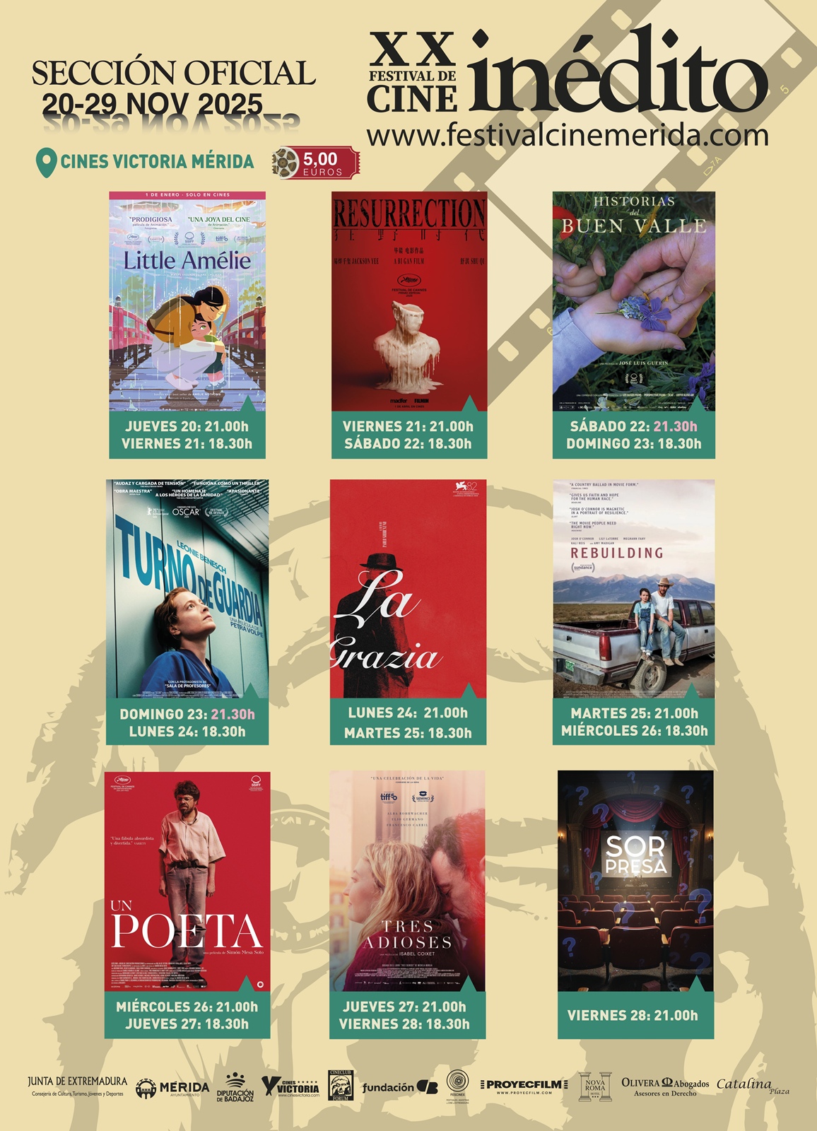 Del 20 al 29 de noviembre tendrá lugar la XX edición del Festival de Cine Inédito de Mérida que en su sección oficial contará, como siempre, con películas de calidad que se emitirán en versión original con subtítulos. Además, no faltaran las secciones ‘Cine y Escuela’ o la ‘Gala de Clausura’ con la entrega de los Premios Miradas.