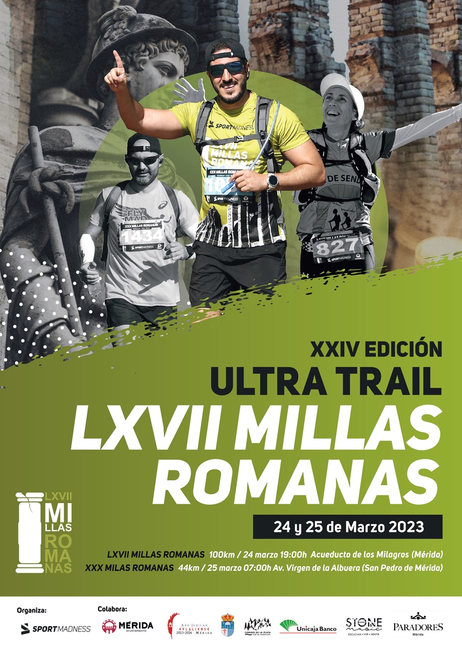 SportMadness, con el apoyo del Club de Senderismo Camino Plata de Mérida, organiza las LXVII Millas Romanas que en 2023 llega a su XXIV edición. Una prueba cuya distancia a recorrer es de 100 km. (por la comarca de Mérida) en un máximo de 24 horas y cuya salida será el viernes, 24 de marzo, desde la explanada del Acueducto de Los Milagros.