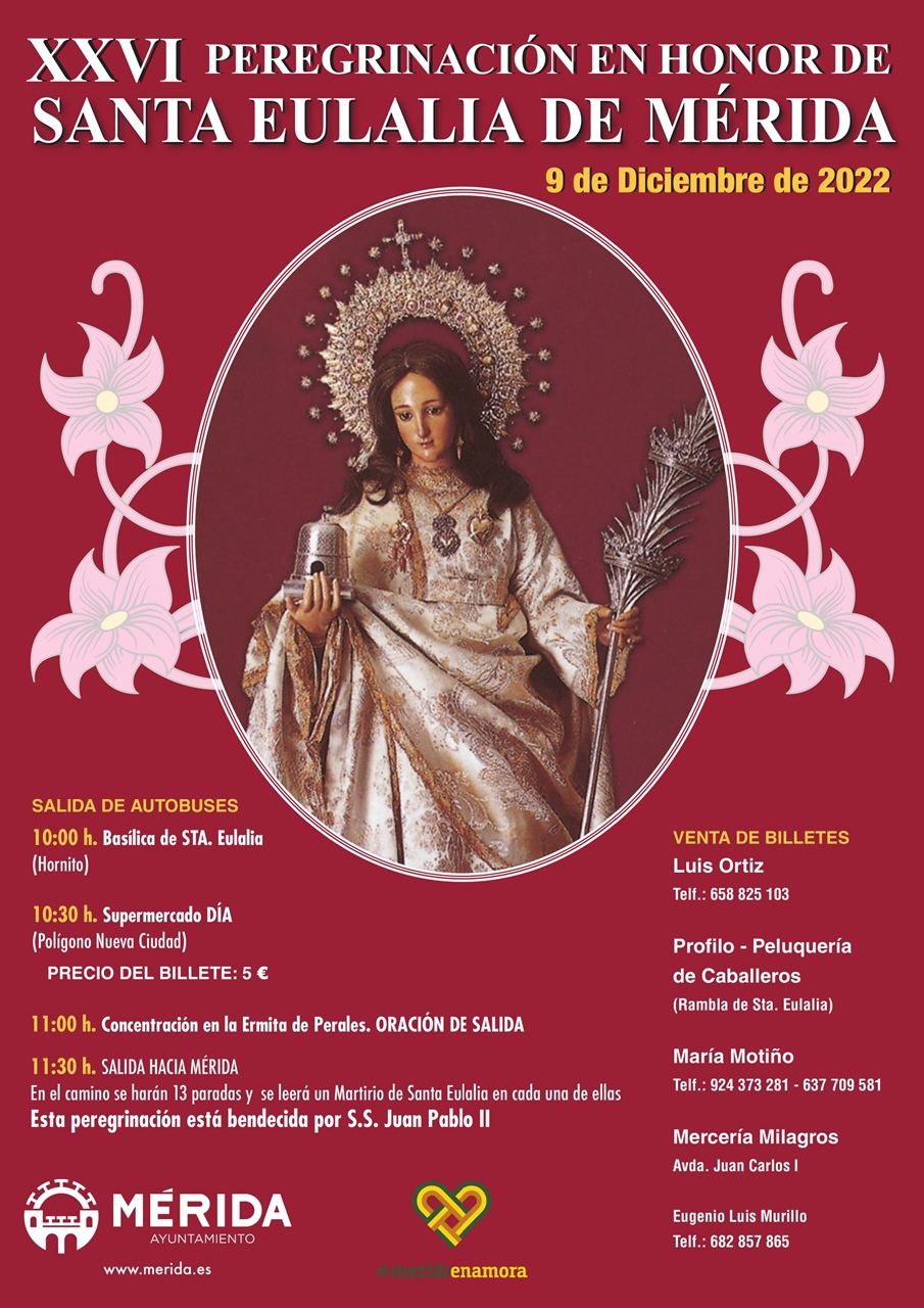 El viernes 9 de diciembre, tendrá lugar la XXVI Peregrinación en Honor a Santa Eulalia de Mérida con salida desde la Ermita de Perales (Arroyo de San Serván) a partir de las 11:30 horas. Durante su recorrido hasta llegar a Mérida se harán 13 paradas y se leerá el Martirio de Santa Eulalia en cada una de ellas. Salida de Autobuses desde Mérida, a las 10:00 horas (Hornito) y 10:30 horas (Supermercado DÍA Nueva Ciudad) con un precio del billete de 5€.