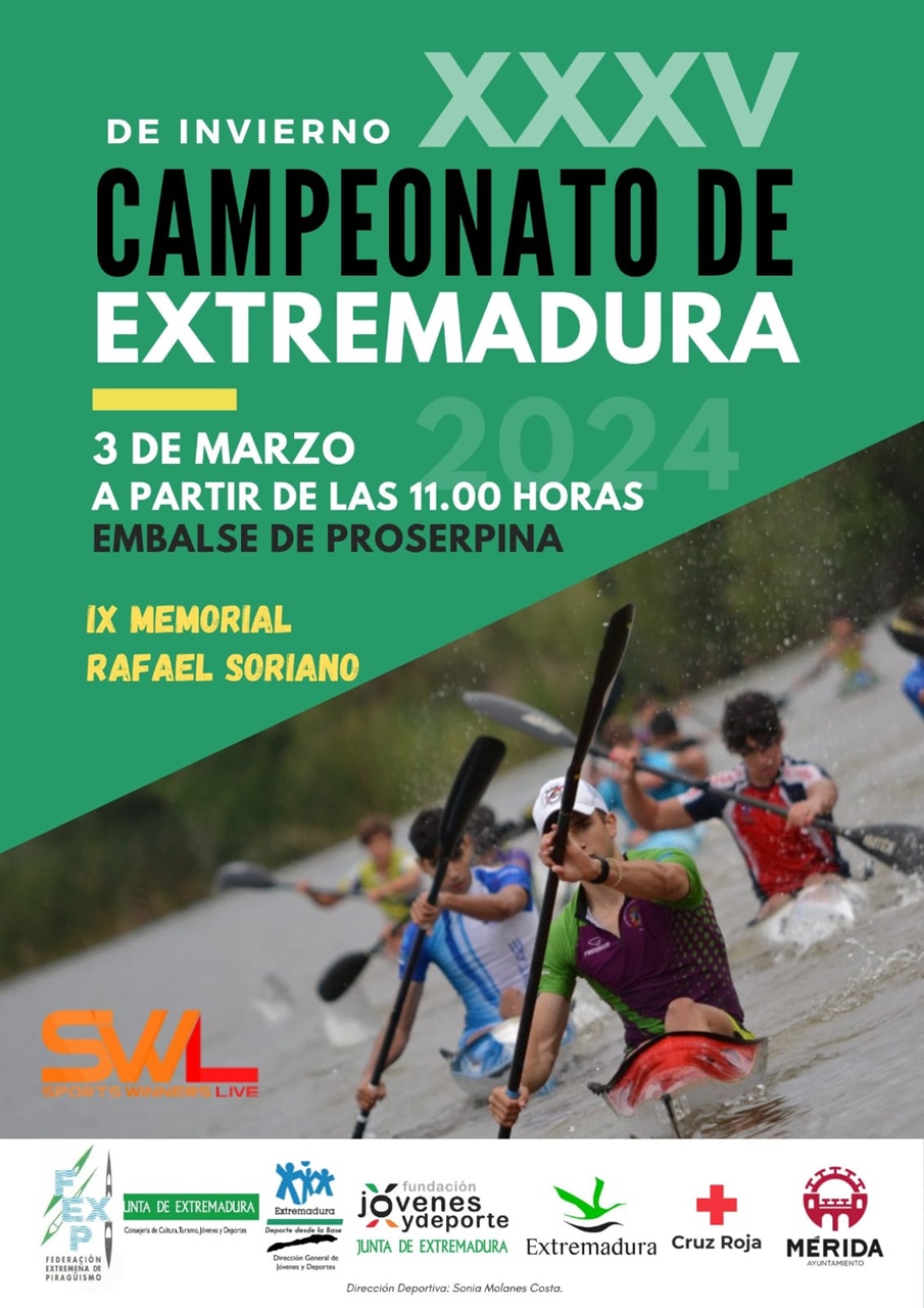 El domingo 3 de marzo de 2024 se celebra, en el Lago de Proserpina, el XXXV Campeonato de Extremadura de Invierno – IX Memorial Rafael Soriano. Las pruebas comenzarán a las 11:00 horas. Organiza Federación Extremeña de Piragüismo