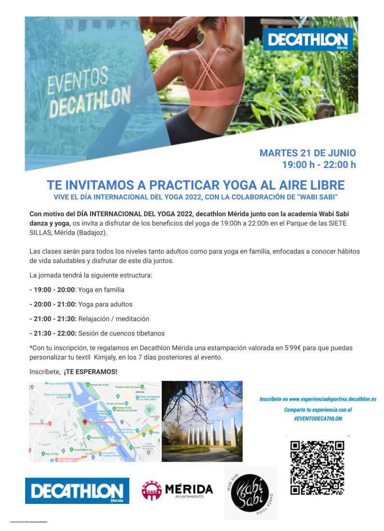 El 21 de junio, a partir de las 19:00 horas, con motivo del Día Internacional del Yoga, Decathlon Mérida y WABI SABI, Danza y Yoga organizan unas sesiones de yoga, meditación y concierto-terapia de cuencos tibetanos, en el Parque de las Siete Sillas. Las clases estarán enfocadas a promocionar hábitos de vida saludable y bienestar de niños y adultos.