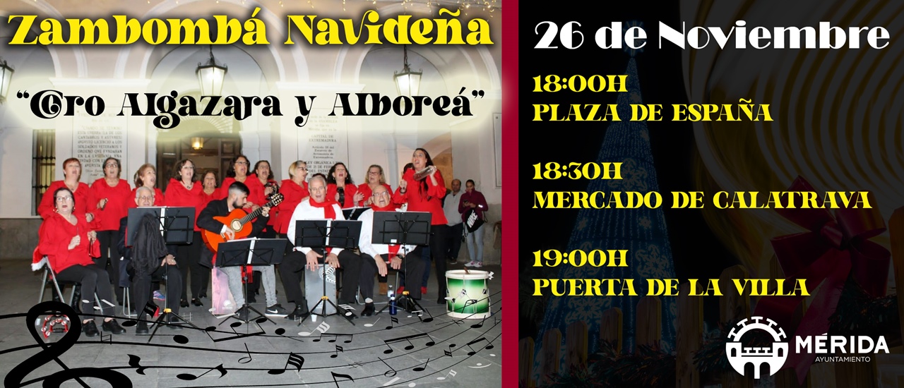 El Coro Algazara y Alboreá ofrecerá una Zambombá Navideña en varios puntos de la ciudad durante el sábado 26 de noviembre. A las 18:00 horas, en la Plaza de España; a las 18:30 horas, en el Mercado Calatrava; y a las 19:00 horas, en la Puerta de la Villa.
