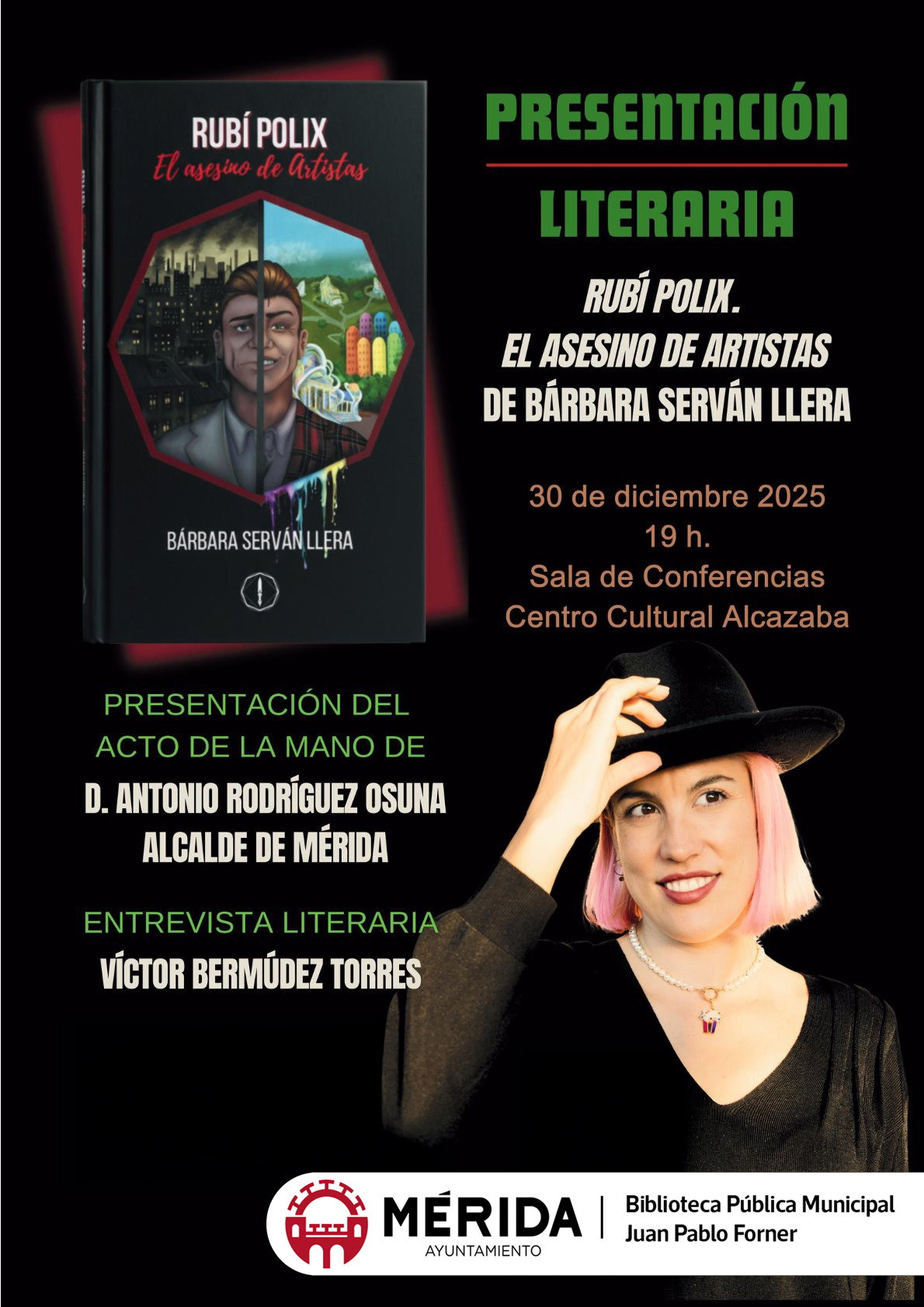 La autora emeritense, Bárbara Serván, presenta su novela negra Rubí Polix. El asesino de Artistas, que ha alcanzado el n.º 1 en preventa de Amazon. Será maána martes, 30 de diciembre, a las 19 horas en el Centro Cultural Alcazaba. En el acto intervendrá el alcalde, Antonio Rodríguez Osuna, y habrá una entrevista literaria a cargo de Víctor Bermúdez.