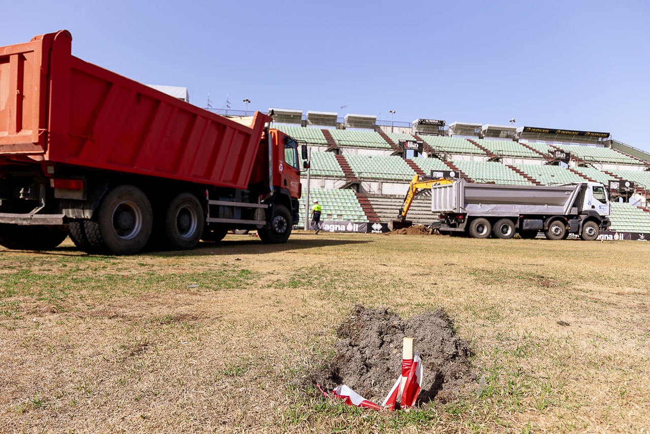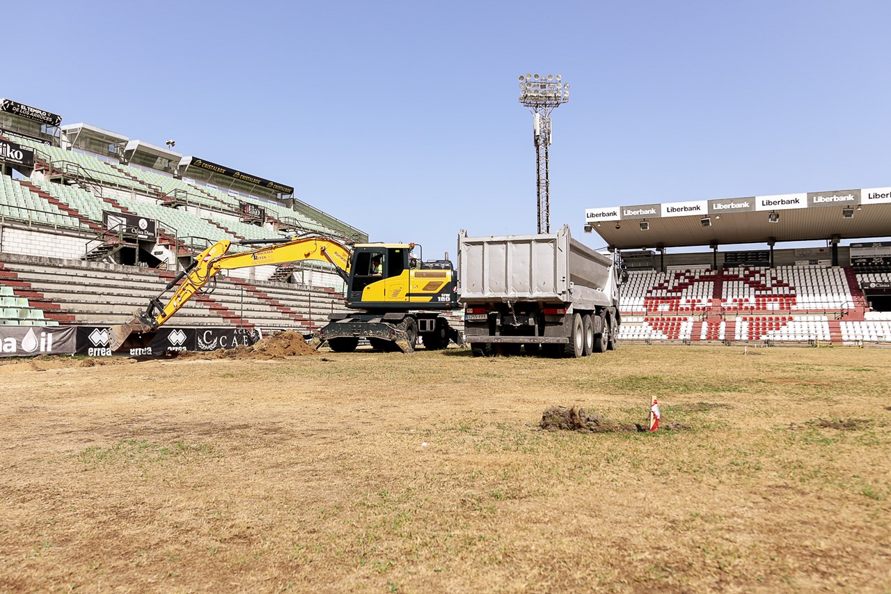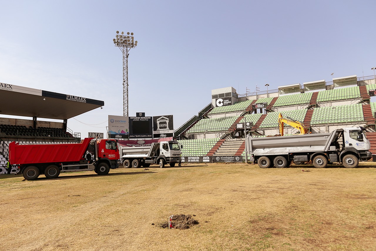 Los trabajos de renovación del césped del Estadio Romano “José Fouto” y el sistema de riego por aspersión avanzan a buen ritmo tras las tareas llevadas a cabo, desde la semana pasada, de replanteo, mediciones y acopio de material. De esta manera, en estos días ya se encuentran las máquinas en el estadio para retirar el césped actual y comenzar con la siembra del nuevo tapete.