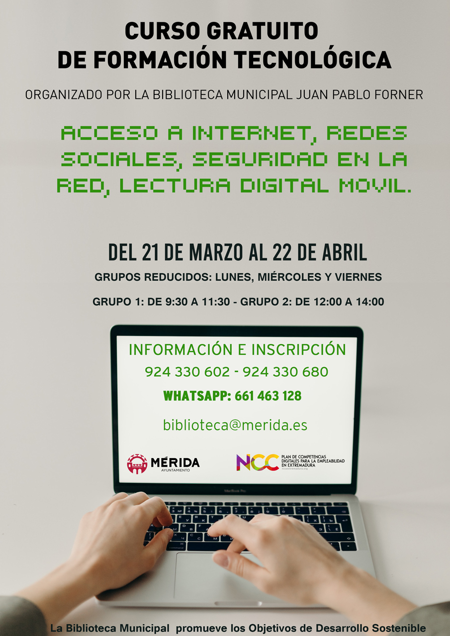La Biblioteca Municipal Juan Pablo Forner, en colaboración con los Nuevos Centros del Conocimiento, organiza un Curso de Formación Tecnológica gratuito para adultos.