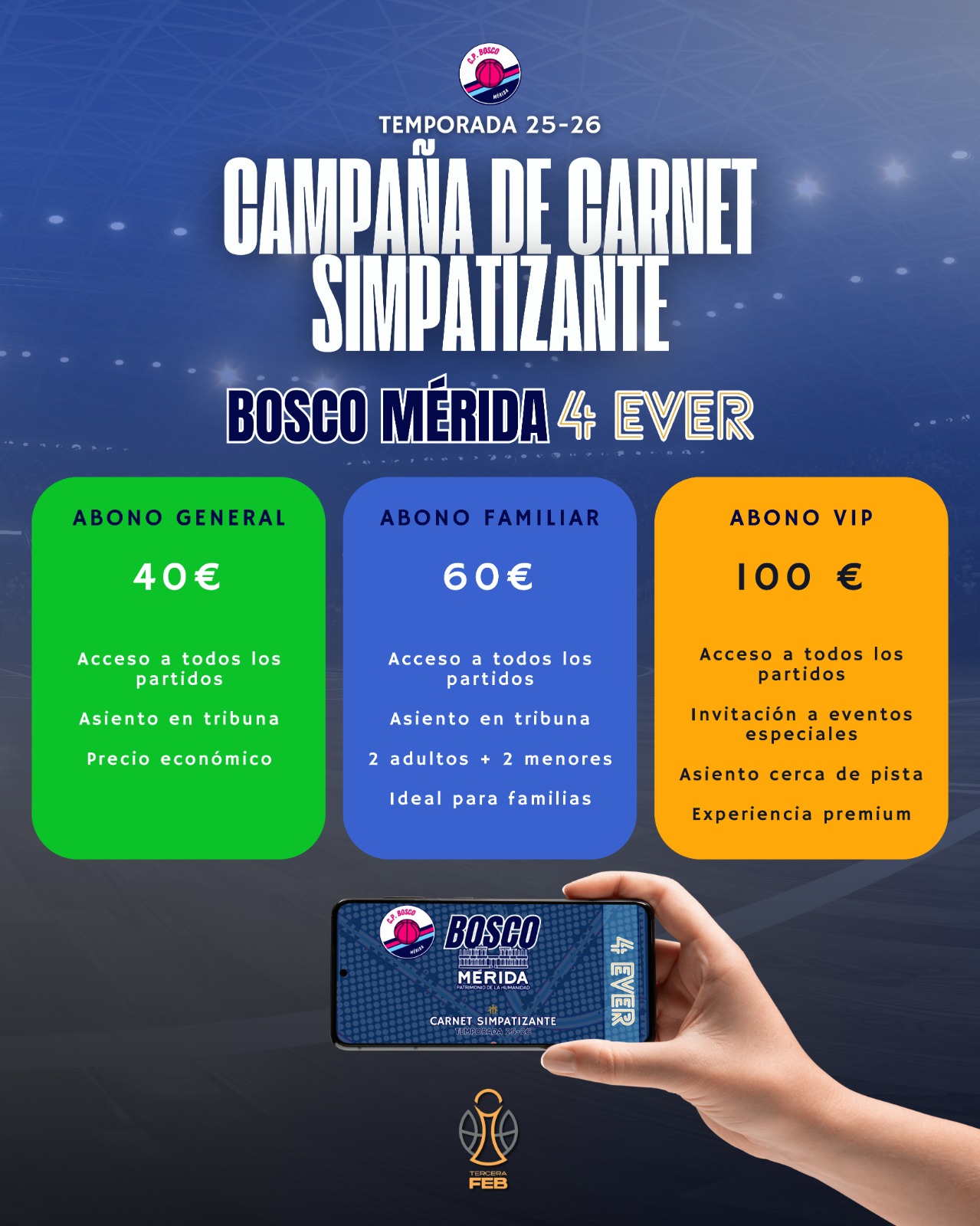 Por último, un carnet VIP con el que se tendrá derecho a asientos a primera fila “y en el descanso tendrá tendremos una zona donde habrá bueno comida y demás”. En relación a este asunto ha señalado que “es fundamental el apoyo de la afición para llenar el pabellón el Guadiana”.