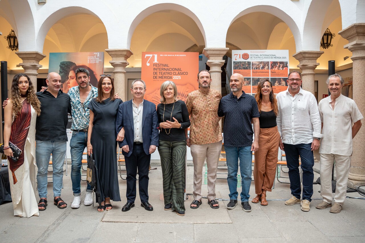 El alcalde de Mérida, Antonio Rodríguez Osuna, ha intervenido este lunes en la presentación de la obra “Cleopatra enamorada, El Musical”, una coproducción del Festival de Mérida y el productor extremeño Pedro Macarro, en un acto, celebrado en la Sede del Festival, en el que también han participado el director de este evento, Jesús Cimarro, el director de la obra, Ignasi Vidal, el dramaturgo extremeño y autor del texto, Florián Recio, el elenco de la obra, así como otras autoridades.