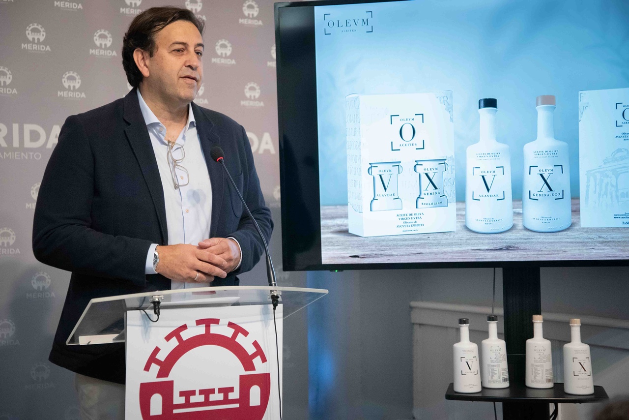 El alcalde presenta ‘Olevm’ la primera marca de aceite de Mérida que fabrica la empresa emeritense ‘Aceites Augusta Emerita S.L.’ que produce 67.600 kg de aceite al año