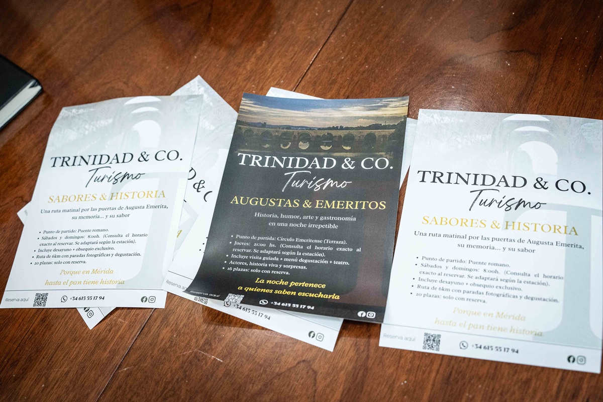 Por su parte María José Trinidad Ruiz explica que “nos dedicamos a realizar experiencias turísticas que unen cultura, gastronomía, historia, teatro y más adelante que estamos en proyecto también música.; arrancamos este jueves con la primera de ellas que es una ruta nocturna que incluye una ruta cultural por el centro de Mérida. Luego habrá una cena en uno de los restaurantes que tiene mejor gastronomía y más reconocida de la ciudad y nos visitará alguien muy importante de la historia de Mérida en tono teatral y humorístico, porque la experiencia se trata de eso, de pasarlo bien, de que comamos, de que disfrutemos, de que conozcamos también muchos productos de aquí de Mérida y de la zona”. Las reservas se pueden realizar en la web trinidadandcoturismo.com