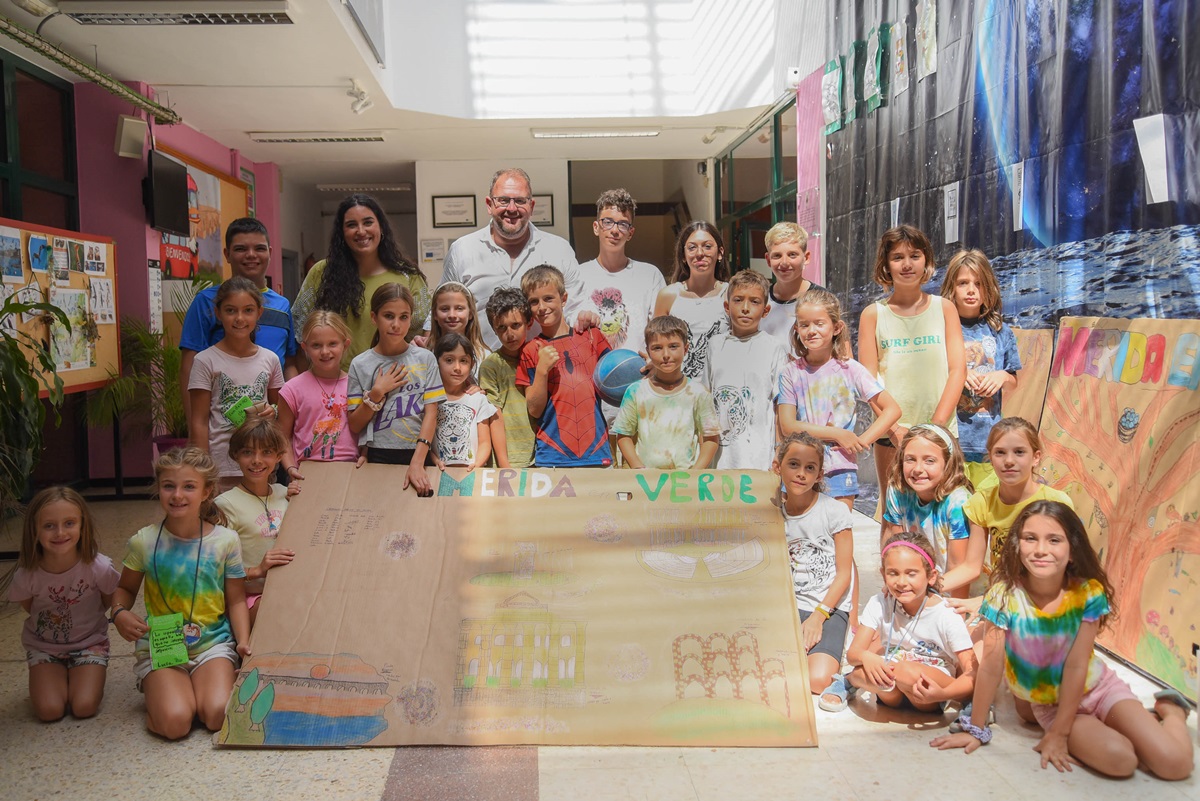 El Alcalde visita el Campamento Multiaventura en la piscina del Polideportivo Guadiana y Mérida en Verde en el CEIP Maximiliano Macías