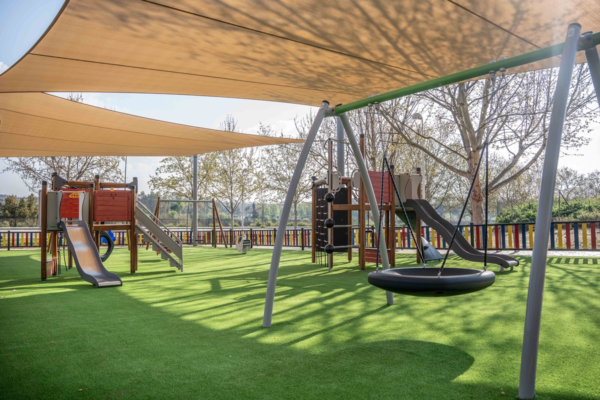 El parque infantil está equipado con pavimentaciones de seguridad para prevenir caídas, estructuras de sombra y vallas de seguridad, garantizando así un entorno seguro y agradable para las niñas y niños.