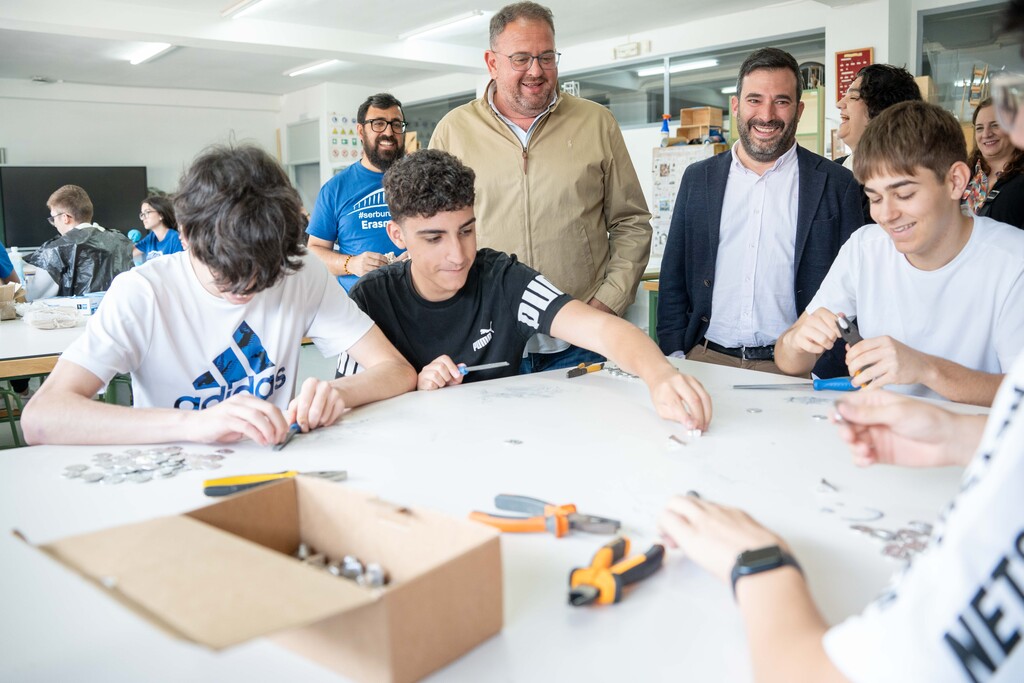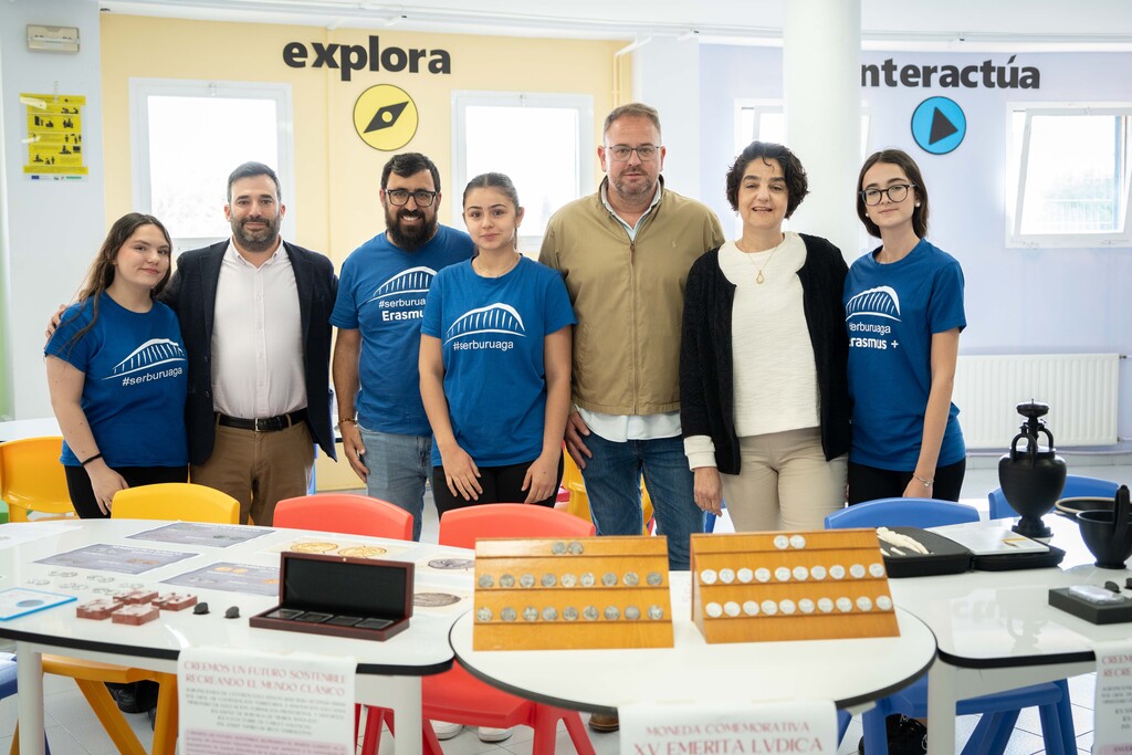 El alcalde, Antonio Roríguez Osuna, y el delegado de Turismo, Felipe González, han visitado esta mañana al alumnado del Instituto de Educación Secundaria “Sáenz de Buruaga” que están acuñando la Moneda Oficial de la XV edición de Emerita Lvdica.