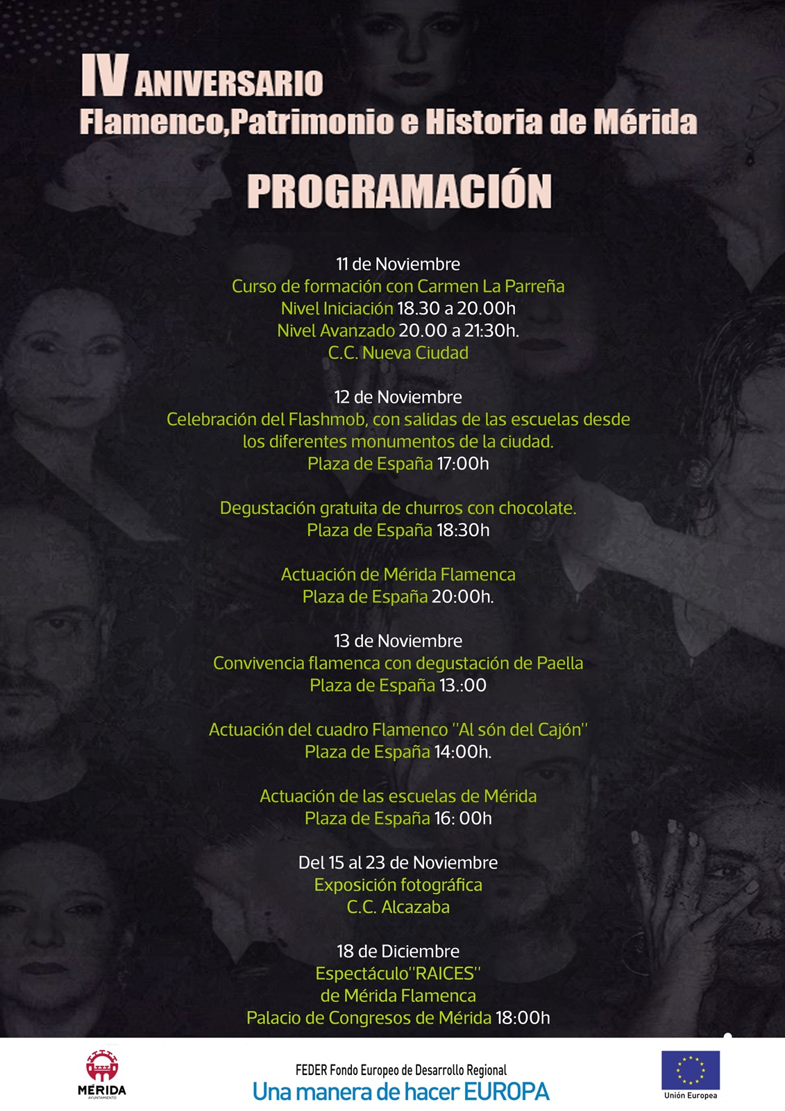 •  El sábado 12 se realizará el multitudinario flashmob por sevillanas en la Plaza España (a las 17:00 horas), acompañado al toque y cante de artistas de Mérida, con unas sevillanas originales de Félix Barrena, dedicadas a nuestra tierra. Posteriormente, degustación de churros con chocolate y la actuación de la Asociación Cultural Mérida Flamenca.