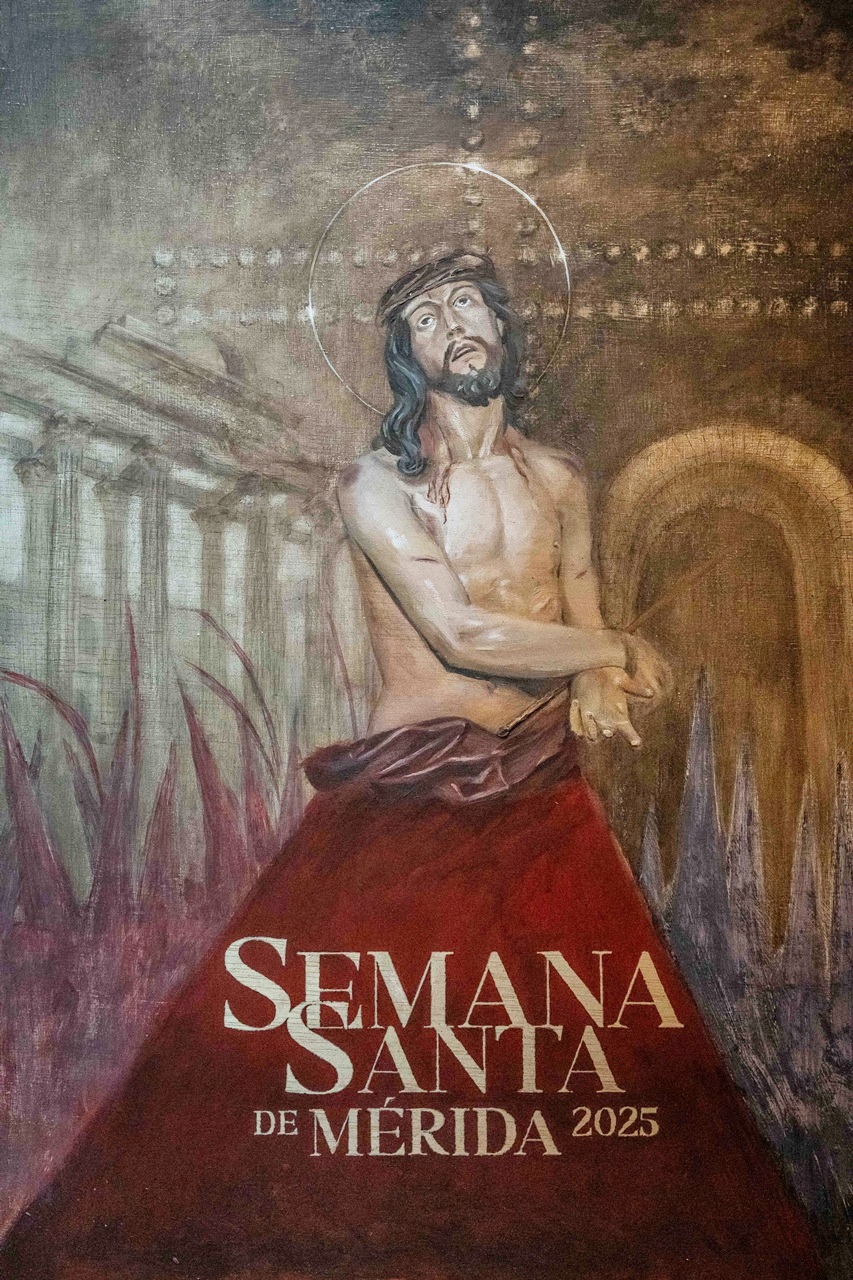 Un composición que, según destaca el propio artista, “es piramidal y cuya principal protagonista es la imagen del Santísimo Cristo de las Injurias, de la Cofradía Infantil, revestido con su túnica roja y en cuya parte inferior aparece el anuncio del acontecimiento ‘Semana Santa de Mérida 2025’”.
