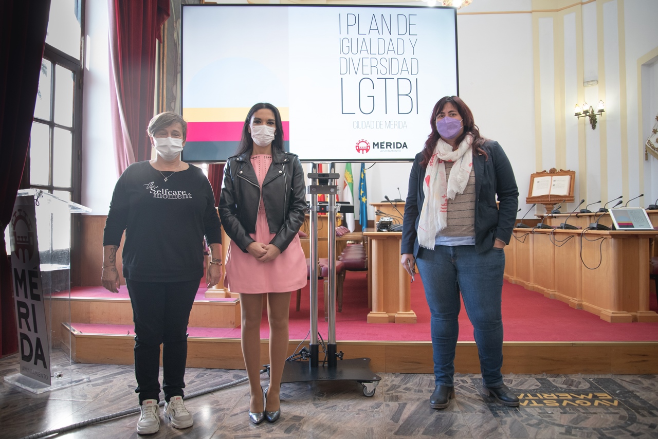 La delegada de Diversidad LGTBI, Pilar Amor, acompañada por las representantes de Extremadura Entiende, Sisi Cáceres. y Fundación Triángulo de Extremadura, Silvia Tostado han presentado el I Plan de Igualdad y Diversidad LGTBI, “que vuelve a convertir a la ciudad de Mérida en pionera en la defensa y garantía de derechos de las personas LGTBI, siendo la primera corporación local de Extremadura en desarrollar un plan LGTBI municipal, situándose entre las pocas ciudades a nivel nacional que lo poseen”.