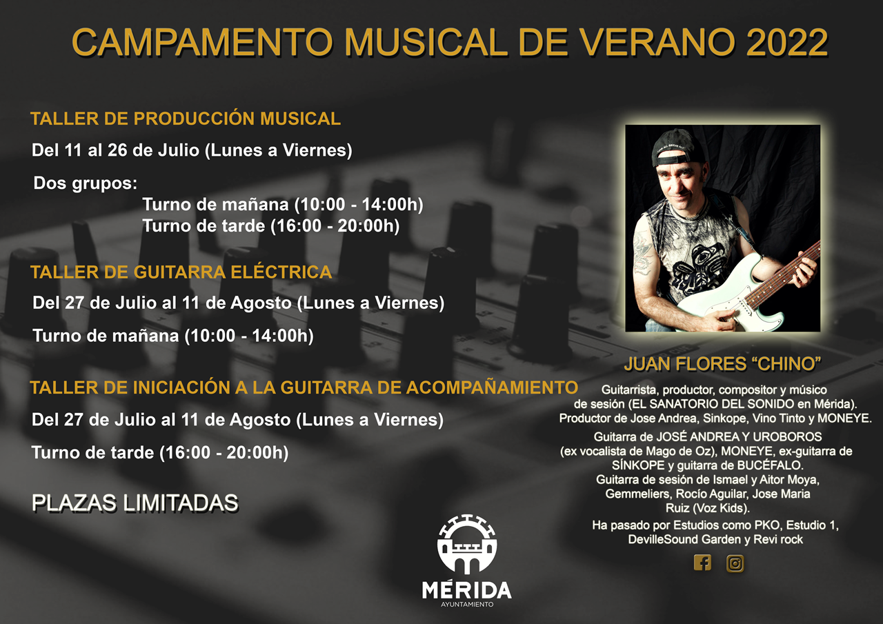 Los cursos serán impartidos por Juan Flores “Chino” guitarrista, productor, compositor y músico de sesión (Estudios el Sanatorio del Sonido). Comenzó su andadura a los 9 años y a los 15 ya tocaba con la banda de rock emeritense Bucéfalo.