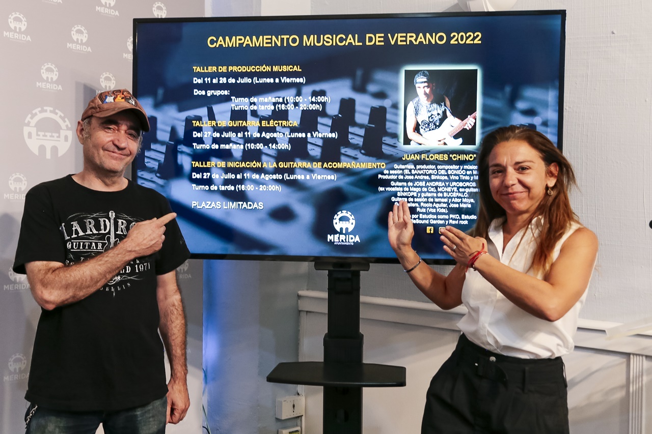 La delegada de Cultura, Silvia Fernández, junto al guitarrista emeritense, Juan Flores “Chino” ha presentado un campamento musical gratuito que se celebrará en el Centro de Ocio Joven ·”El economato” del 11 de julio al 11 de agosto para jóvenes con edades a partir de 14 años.