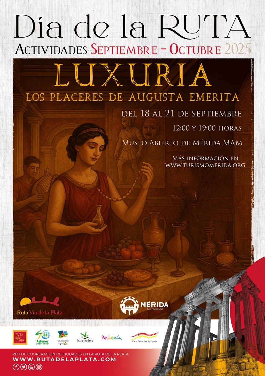 Mérida celebra el Día de la Ruta Vía de la Plata 2025 con las siguientes actividades del 18 al 21 de septiembre: El Cluedo Urbano “Misterio en Emerita”, que se celebra el 21 de septiembre y para el que se han agotado todas las plazas, es una experiencia inmersiva inspirada en la antigua Augusta Emerita donde los participantes se sumergen en un misterioso asesinato y deben resolverlo a través de la interpretación de personajes y la investigación de pistas en los entornos monumentales de la ciudad.