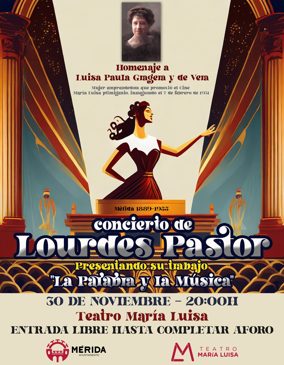 El 30 de noviembre a las 20H se celebrará un homenaje y reconocimiento a Doña Luisa Paula Gragera y de Vera, en el Teatro María Luisa junto con el espectáculo de Lourdes Pastor “La palabra y la música”.