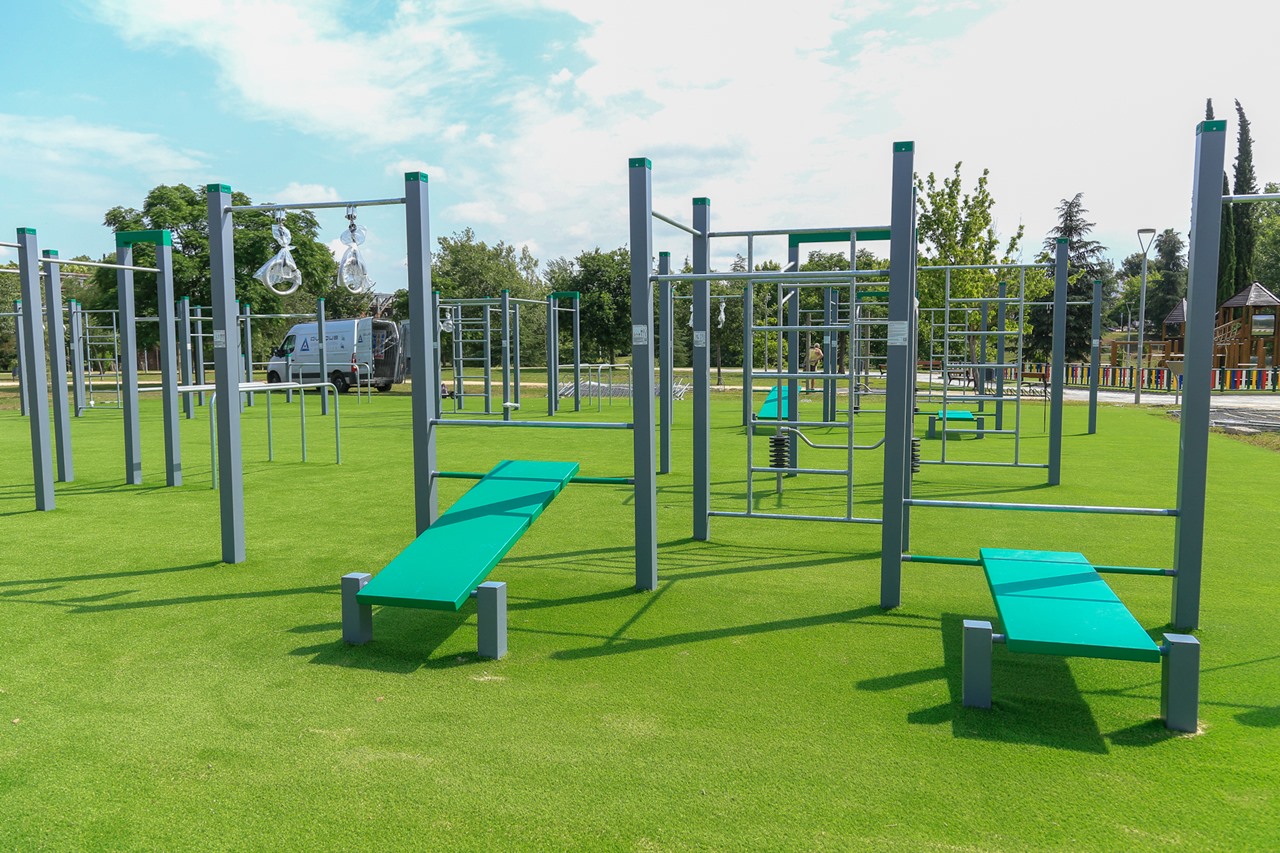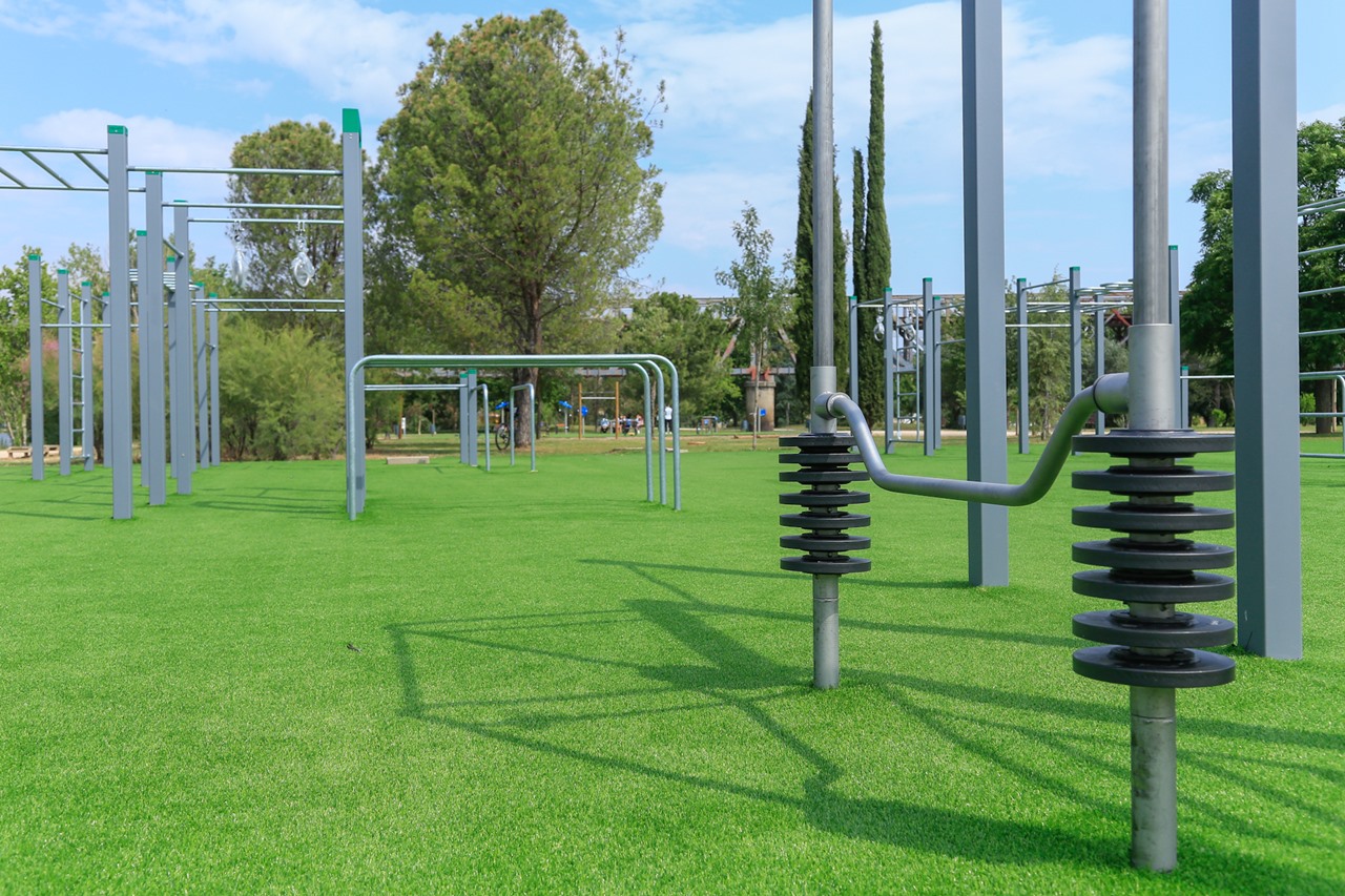 Se trata de un área de 858 m2 para la zona de calistenia, que forma parte de una zona ajardinada con su correspondiente instalación de riego, con pradera natural y algunos árboles y coníferas. Se eligió esta zona porque en ella ya existían algunos elementos deportivos para el ejercicio al aire libre.