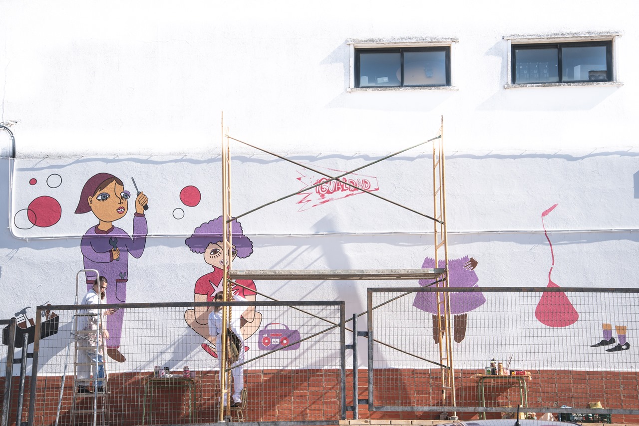 El mural reivindica aquellas profesiones, tradicionalmente de hombres, que pueden desempeñar, en igualdad, las mujeres.