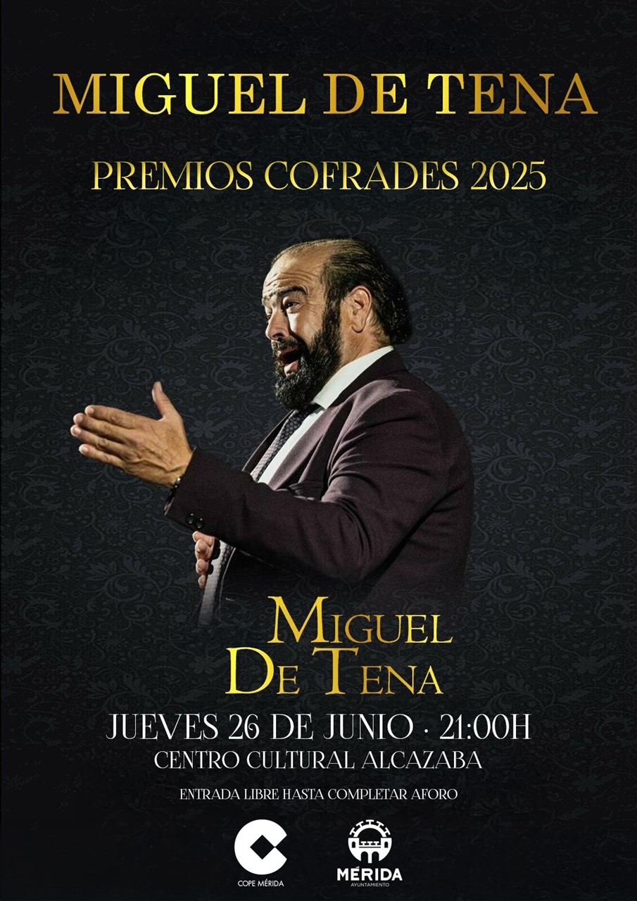 Miguel de Tena será el encargado de poner la el toque musical a la Gala de Premios Cofrades 2025, que se celebrará el próximo jueves 26 de junio, a las 21 horas, en el Centro Cultural Alcazaba, con entrada gratuita hasta completar aforo.