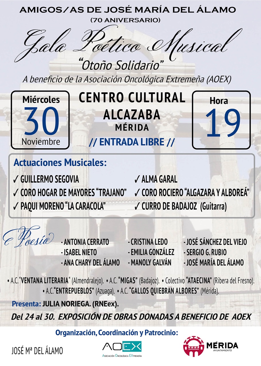 El Auditorio del Centro Cultural Alcazaba acogerá mañana miércoles la Gala Poético-Musical “Otoño Solidario” a beneficio de la Asociación Oncológica Extremeña (AOEX).