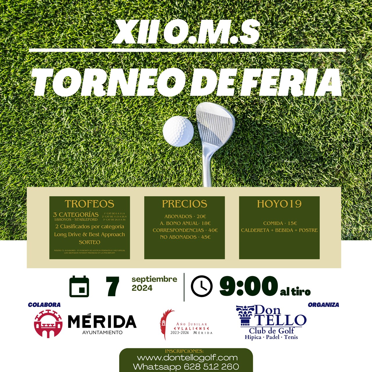 El club de Golf Don Tello acoge el próximo sábado,. 7 de septiembre el XII O.M. S. Torneo de Feria con hora de salida a las 9:00, en la modalidad individual stableford y en el que podrá participar todo aquel jugador con licencia en vigor y hcap nacional asignado.
