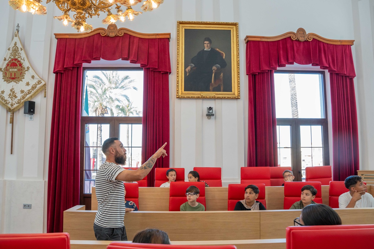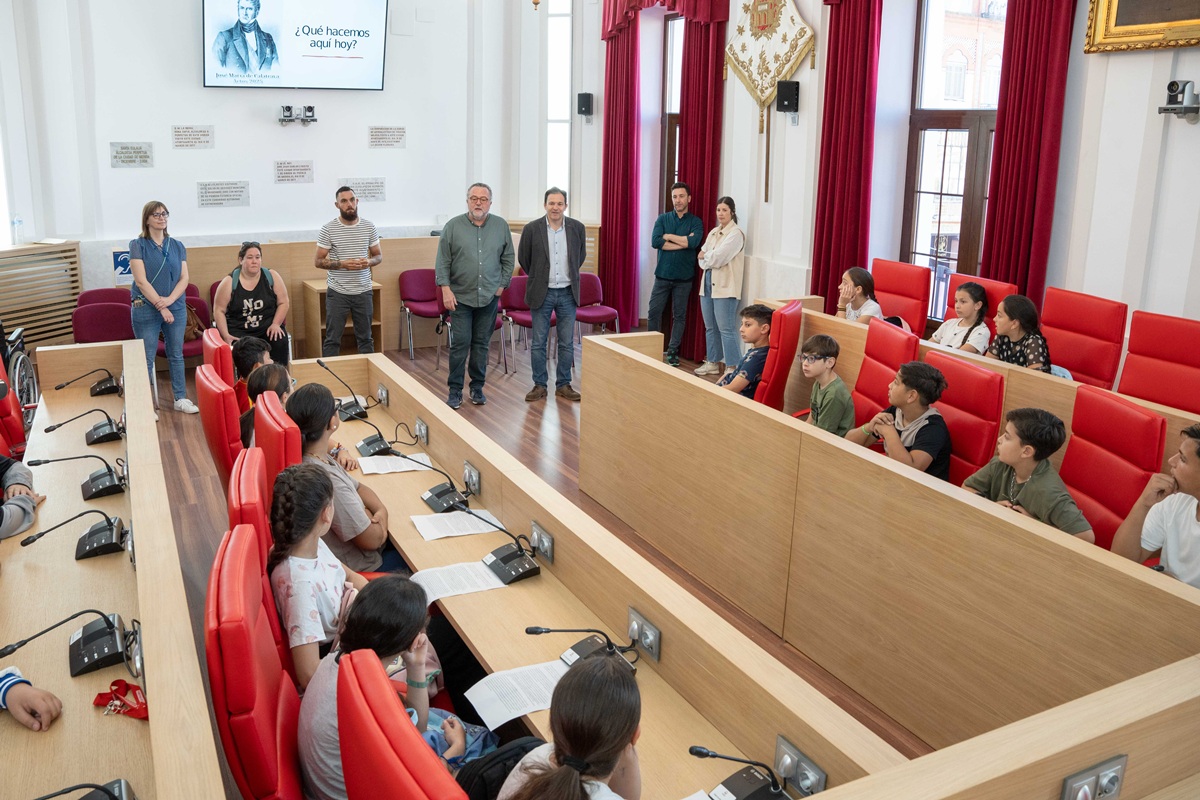 El delegado de cultura, Antonio Vélez, ha mostrado hoy a alumnos del CEIP José María Calatrava el cuadro sobre este político emeritense que desde hace unas semanas se encuentra en el Salón de Plenos.