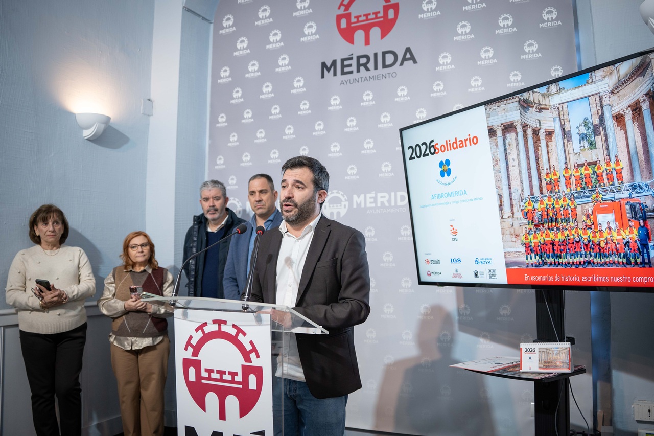 El delegado de Turismo, Felipe González, ha presentado esta mañana el Calendario Solidario 2026, una iniciativa promovida por el Cuerpo de Bomberos de Mérida, con el apoyo del Ayuntamiento de Mérida, el Consorcio de la Ciudad Monumental, y las asociaciones de recreación histórica Emerita Antiqua y Ara Concordiae, con el objetivo de respaldar la labor de AfibroMérida.