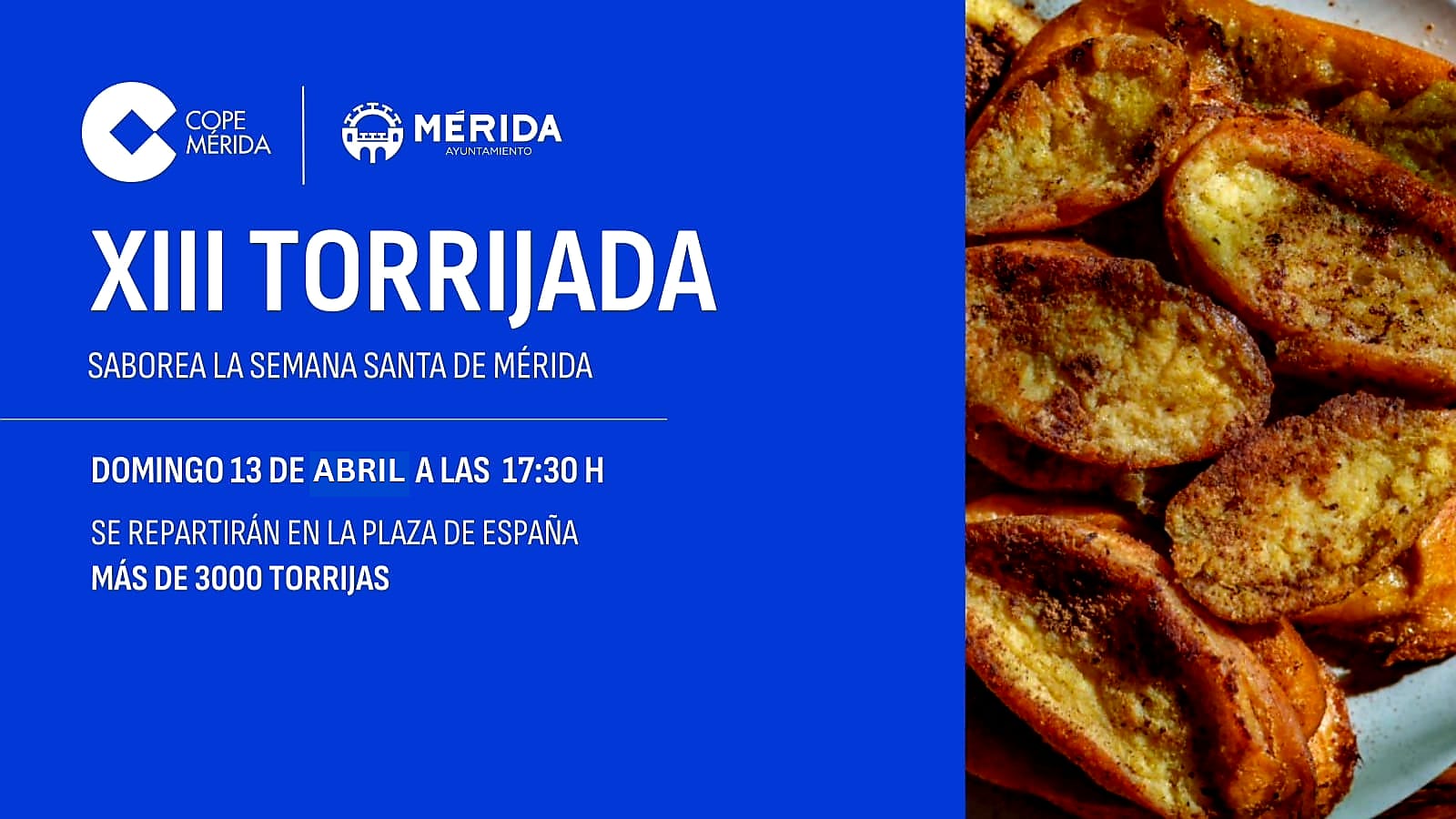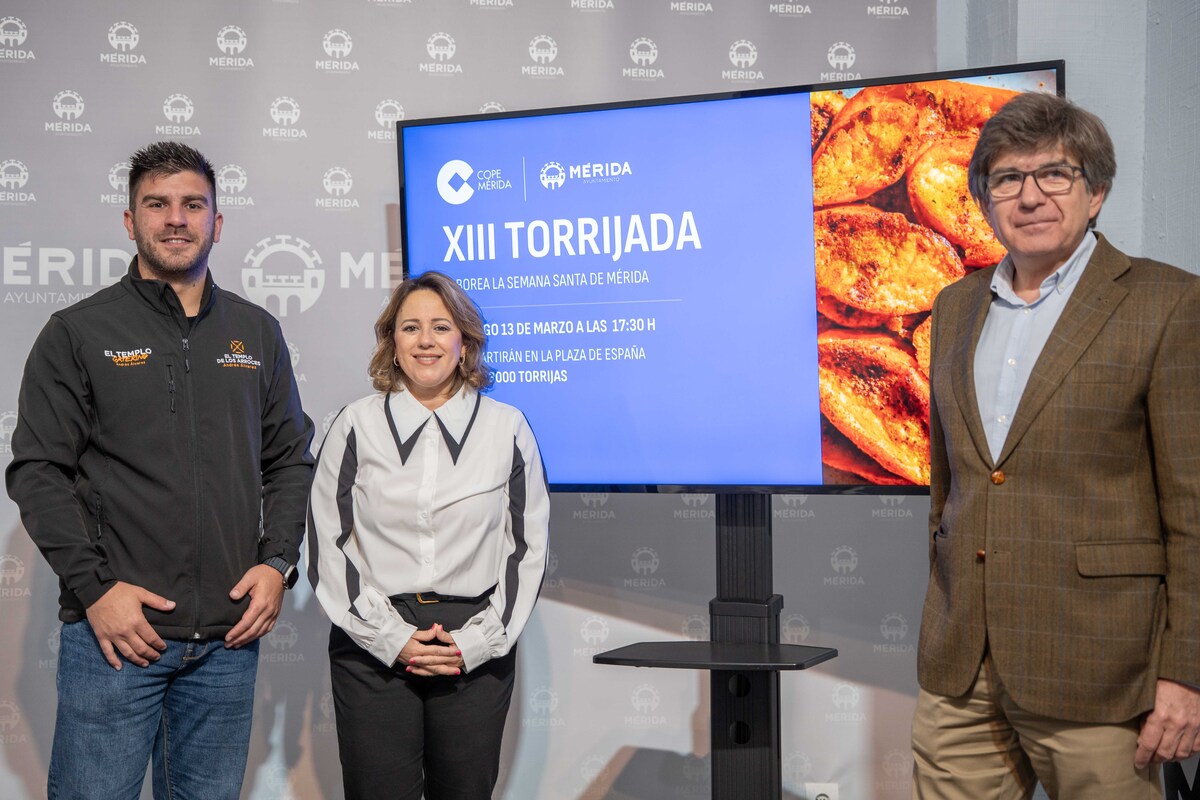 La delegada de Semana Santa, Ana Aragoneses, acompañada por el director de COPE en Extremadura, José Enrique Pardo, ha presentado esta mañana la XIII edición de la Torrijada Popular que se celebrará este Domingo de Ramos en la Plaza de España, a partir de las 17,30 horas, y en la que se repartirán, de manera gratuita, más de 3.000 torrijas.