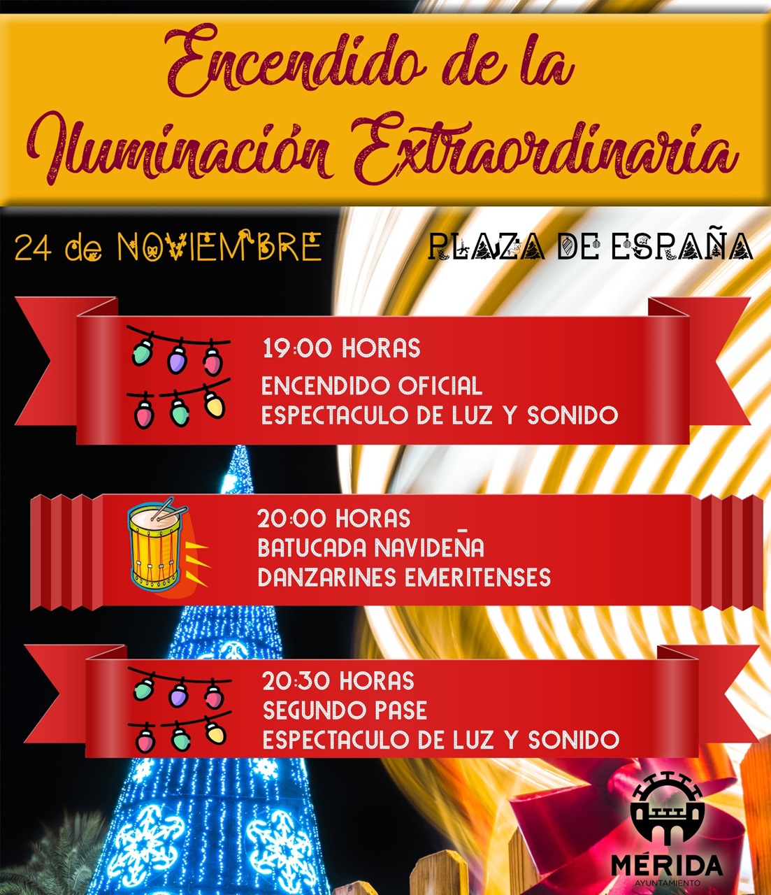 Música, luz y sonido para dar el pistoletazo de salida a la Navidad con más actividades de la historia de Mérida. La Navidad se inaugura en Mérida hoy jueves, 24 de noviembre, con el acto oficial de encendido de la iluminación extraordinaria que cuenta con más de 700 mil puntos leds de bajo consumo y muchas novedades en la decoración.