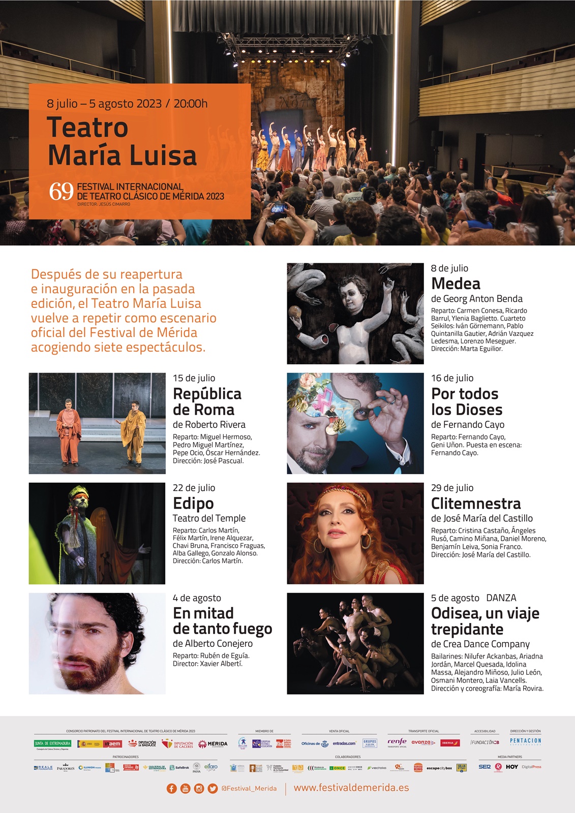 Después de su reapertura e inauguración en la pasada edición, el Teatro María Luisa vuelve a repetir como escenario oficial del Festival de Mérida acogiendo 7 espectáculos: Medea, una coproducción del Festival de Mérida con la Fundación Juan March, protagonizada por Carmen Conesa; seguirá República de Roma con Miguel Hermoso y Por todos los dioses, un monólogo protagonizado por Fernando Cayo, Edipo de Teatro del Temple. A continuación Cristina Castaño se meterá en la piel de Clitemnestra, un espectáculo que vuelve al Festival después de estrenarse en las extensiones de Medellín y Cáparra en 2020. Y para cerrar dos propuestas llegadas desde Cataluña: En mitad de tanto fuego, un monólogo escrito por Alberto Conejero y dirigido por Xavier Alberti y Odisea, un espectáculo de la compañía Crea Dance, de María Rovira.