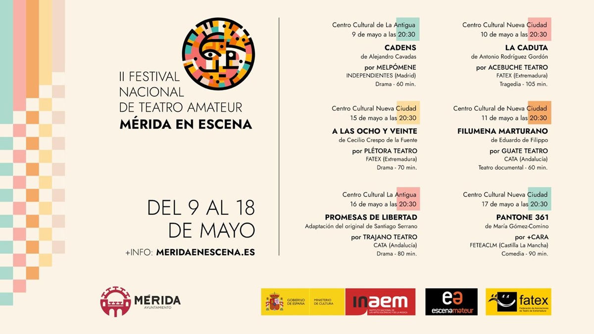 El Festival Nacional de Teatro Amateur “Mérida en Escena”, organizado por el Ayuntamiento junto con la Federación de Compañías de Teatro Amateur de Extremadura (FATEX) y la Confederación nacional Escenaamateur, se celebrará del 9 al 18 de mayo, ofreciendo una programación seleccionada que demuestra la madurez artística y la capacidad de abordar temas complejos y relevantes por parte de los grupos no profesionales.