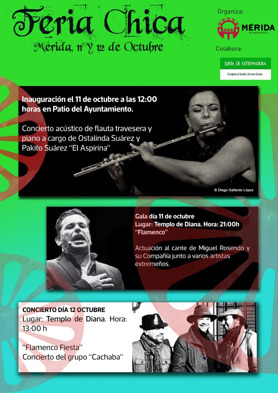 El próximo lunes, 11 de octubre, se inician los actos de la tradicional Feria Chica de Mérida que, en esta ocasión, concluirán el martes 12 de octubre y que consistirán en varias actuaciones musicales con las que el Ayuntamiento sigue apostando por esta celebración tradicional de la ciudad.