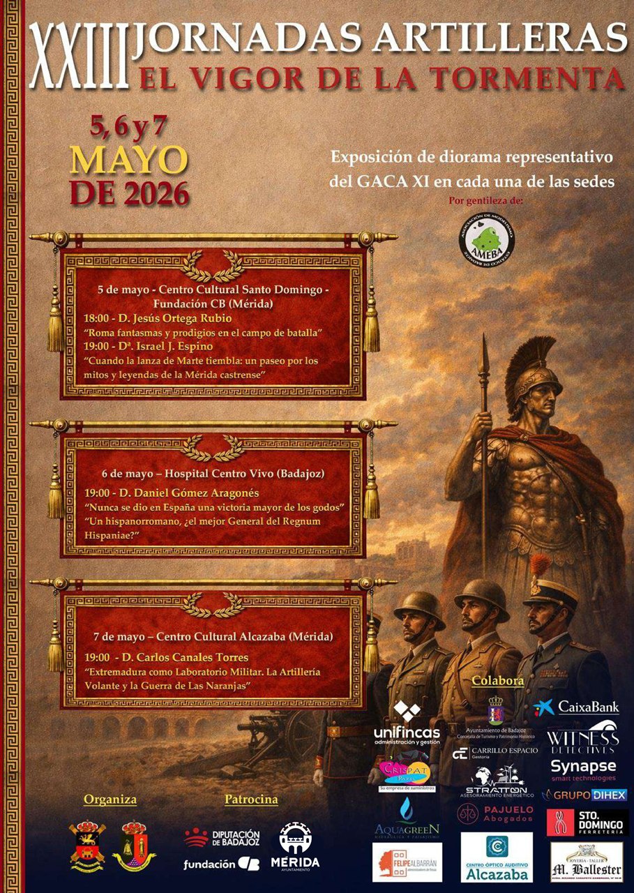Finalmente, el jueves 7 de mayo, en el Centro Cultural Alcazaba (Mérida), a las 19:00 horas, D. Carlos Canales Torres cerrará las jornadas con la ponencia “Extremadura como laboratorio militar: la Artillería volante y la Guerra de las Naranjas”.