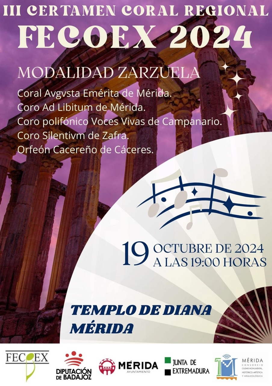 El próximo sábado, 19 de octubre, a partir de las 19 horas, el Templo de Diana acoge el III Certamen Coral Regional Fecoex 2024 (Modalidad Zarzuela) con la participación de la Coral Augusta Emérita, el Coro Ad Libitum, el Coro polifónico Voces Vivas de Campanario, Coro Silentivm de Zafra y el Orfeón Cacereño.