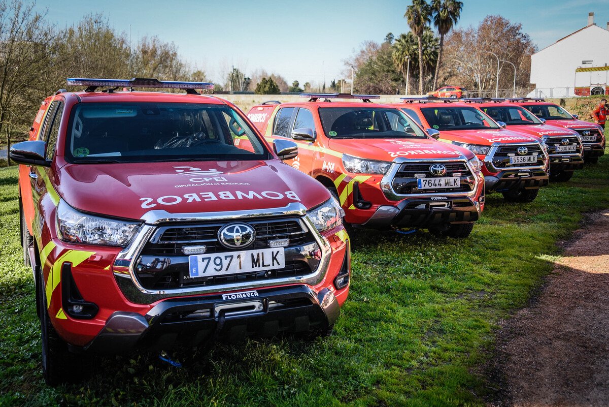 El alcalde, Antonio Rodríguez Osuna, y la delegada de Hacienda, Carmen Yáñez, han asistido a la presentación de los 6 vehículos contra incendios y salvamento para el Consorcio de Bomberos de la Diputación de Badajoz (CPEI-Badajoz), en concreto, de 3 Vehículos polivalentes 4×4 Pick-Up de Rescate (PIR) y 3 Vehículos polivalentes 4×4 Pick-Up de Extinción (PIE), carrozados sobre chasis Toyota Hilux GX de doble cabina, adquiridos por la Diputación de Badajoz por un importe de 480.000,00 €
