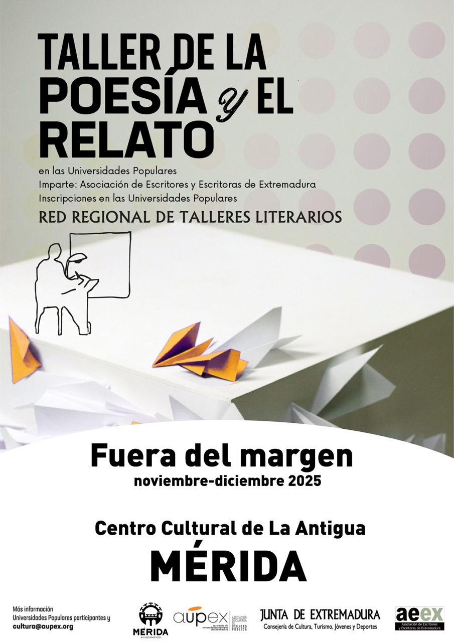 - El taller de escritura creativa denominado “Fuera del margen” en el que “partiendo de una reflexión acerca de los valores de la escritura , la literatura y la poesía, se pretende desarrolla la capacidad creadora mediante el aprendizaje de técnicas narrativas, al tiempo que fomentando el conocimiento de los principales estilos y géneros literarios”