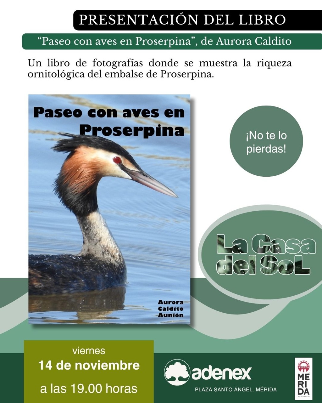 14 de noviembre. Presentación del libro “Paseo con aves en Proserpina”. A las 19:00 horas, en La Casa del Sol (sede de ADENEX), tendrá lugar la presentación del libro “Paseo con aves en Proserpina”, de Aurora Caldito. Una obra fotográfica que recoge la riqueza ornitológica del embalse de Proserpina y muestra, a través de la mirada de su autora, la belleza de este entorno natural tan emblemático.