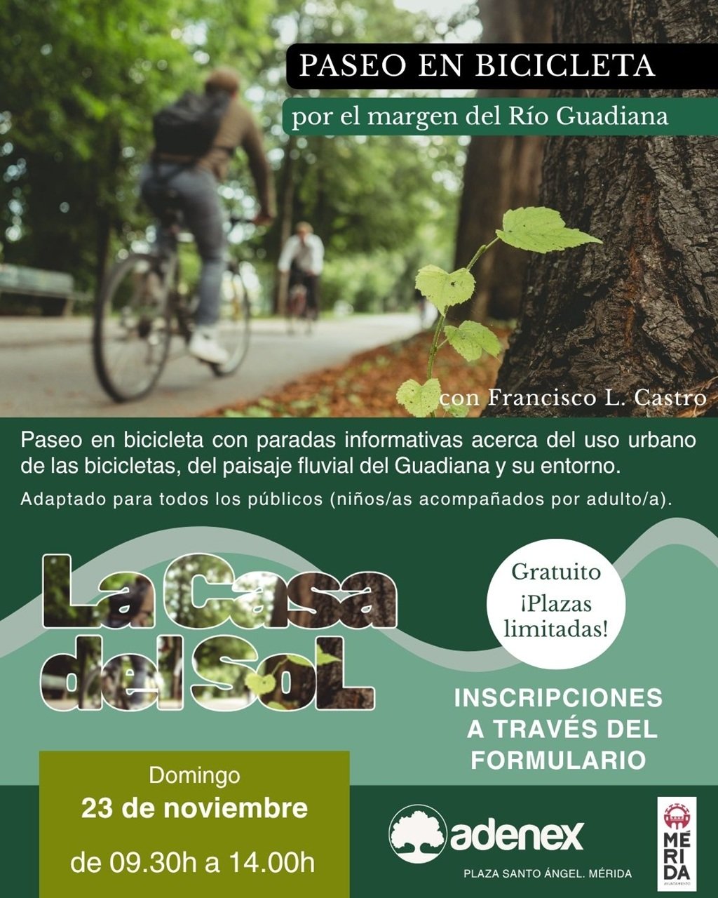 23 de noviembre. Paseo en bicicleta por la margen del río Guadiana. Una actividad guiada por Francisco L. Castro, que propone recorrer la margen del río Guadiana en bicicleta con pequeñas paradas para la interpretación del entorno y la reflexión sobre el uso urbano de este medio de transporte sostenible. Una experiencia pensada para todos los públicos (niñas y niños acompañados de persona adulta) que combina naturaleza, movilidad y conciencia ambiental.