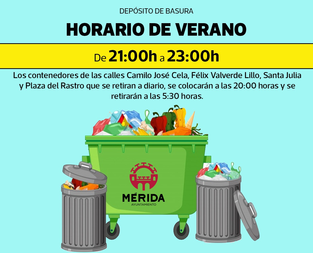 Desde la delegación de Limpieza Viaria se informa que, ya está en vigor el horario de verano en el servicio de recogida de residuos con lo que se modifican, igualmente, los horarios de depósito de los mismos en los contenedores.