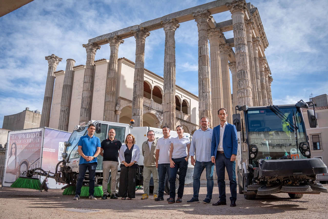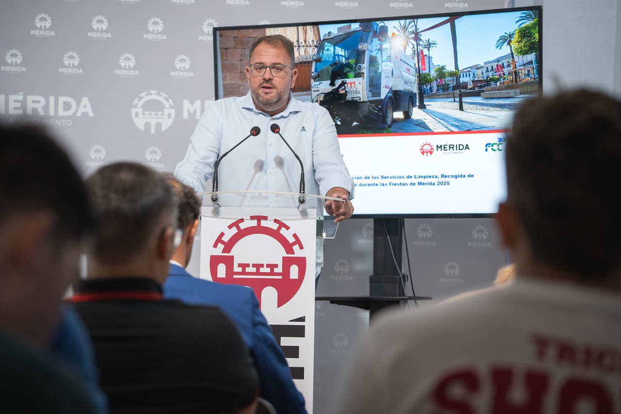 El alcalde de Mérida, Antonio Rodríguez Osuna, junto al director regional de Extremadura de FCC Medio Ambiente, Óscar Zubelzu, ha presentado este viernes la nueva campaña de comunicación y concienciación de los servicios de limpieza viaria, recogida de residuos y mantenimiento de jardines municipales y el refuerzo que se llevará a cabo durante la Feria y Fiestas de Mérida 2025.