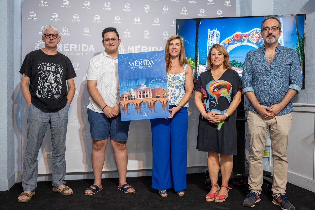 La delegada de Festejos, Ana Aragoneses, ha presentado este jueves el cartel anunciador de la Feria y Fiestas de Mérida 2025, acompañada por los componentes del jurado de esta edición: Rosario Maestre, profesora de la Academia de arte `Edartem´ (presidenta), Jesús Pizarro, profesor de la Escuela de Arte de Mérida, José Luis Muriel, fotógrafo profesional del Gabinete de Comunicación del Ayuntamiento de Mérida, Carlos Murillo, representante del Gabinete de Comunicación y experto en diseño gráfico del Ayuntamiento de Mérida, y Óscar Rueda, presidente de la Federación de Asociaciones vecinales de Mérida.