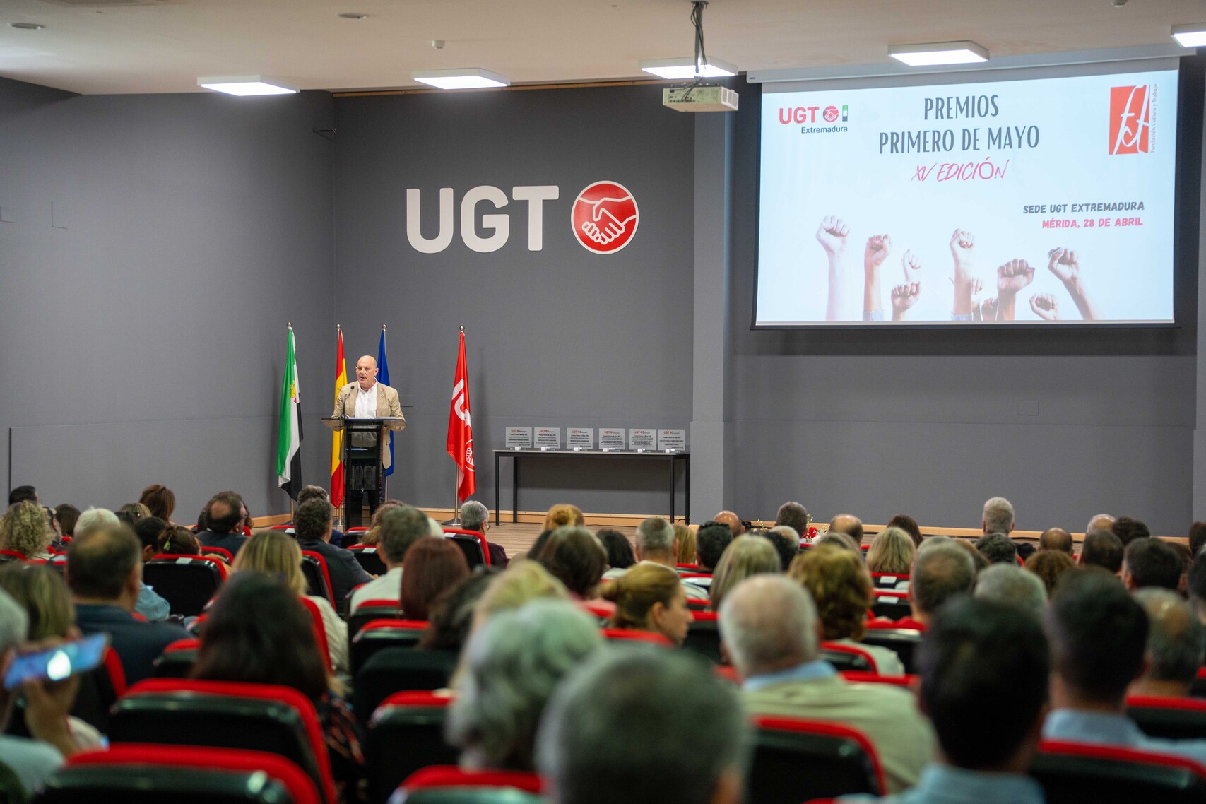 La Primera Teniente de Alcalde, Carmen Yáñez, y el portavoz municipal, Julio César Fuster, han asistido este martes al acto de la decimoquinta edición de los Premios Primero de Mayo, organizados por la Fundación Cultura y Trabajo junto con UGT Extremadura.