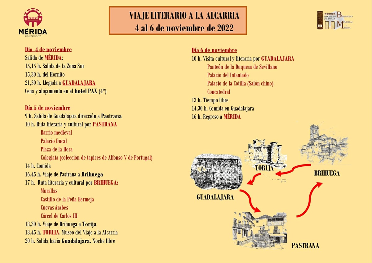 Ahora la Asociación de Amigos y la Biblioteca Municipal de Mérida organizan un viaje literario para conocer y leer in situ las vivencias que el Premio Nobel recoge en sus textos; Guadalajara, Torija, Brihuega, Pastrana, etc. son algunos de los municipios de este viaje donde la literatura, arte, naturaleza, gastronomía, e historia se unen en esta ruta cultural que se va a realizar los días del 4 al 6 de noviembre de 2022.