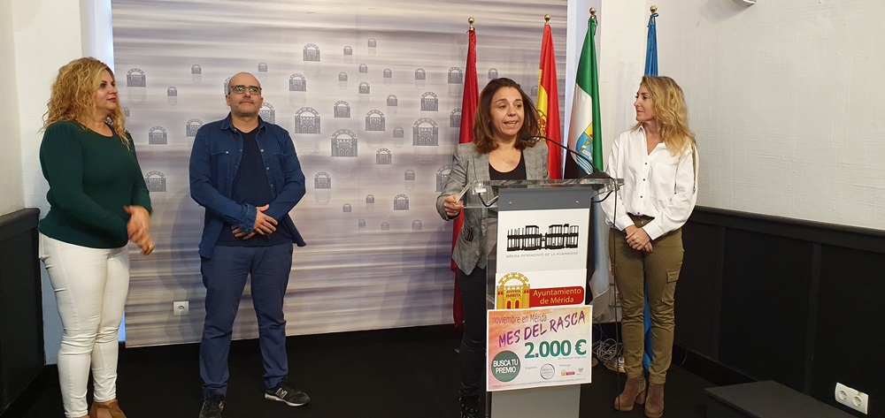 La delegada de Industria y Comercio, Silvia Fernández, ha acompañado a los representantes de la Asociación de Comerciantes Emerita Augusta en la presentación de la segunda edición de Rasca y Gana, una tarjeta que se puede adquirir por 50 céntimos y que da derecho a participar en sorteos con importantes premios.